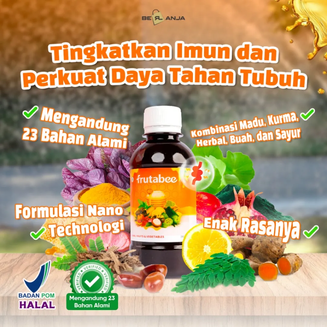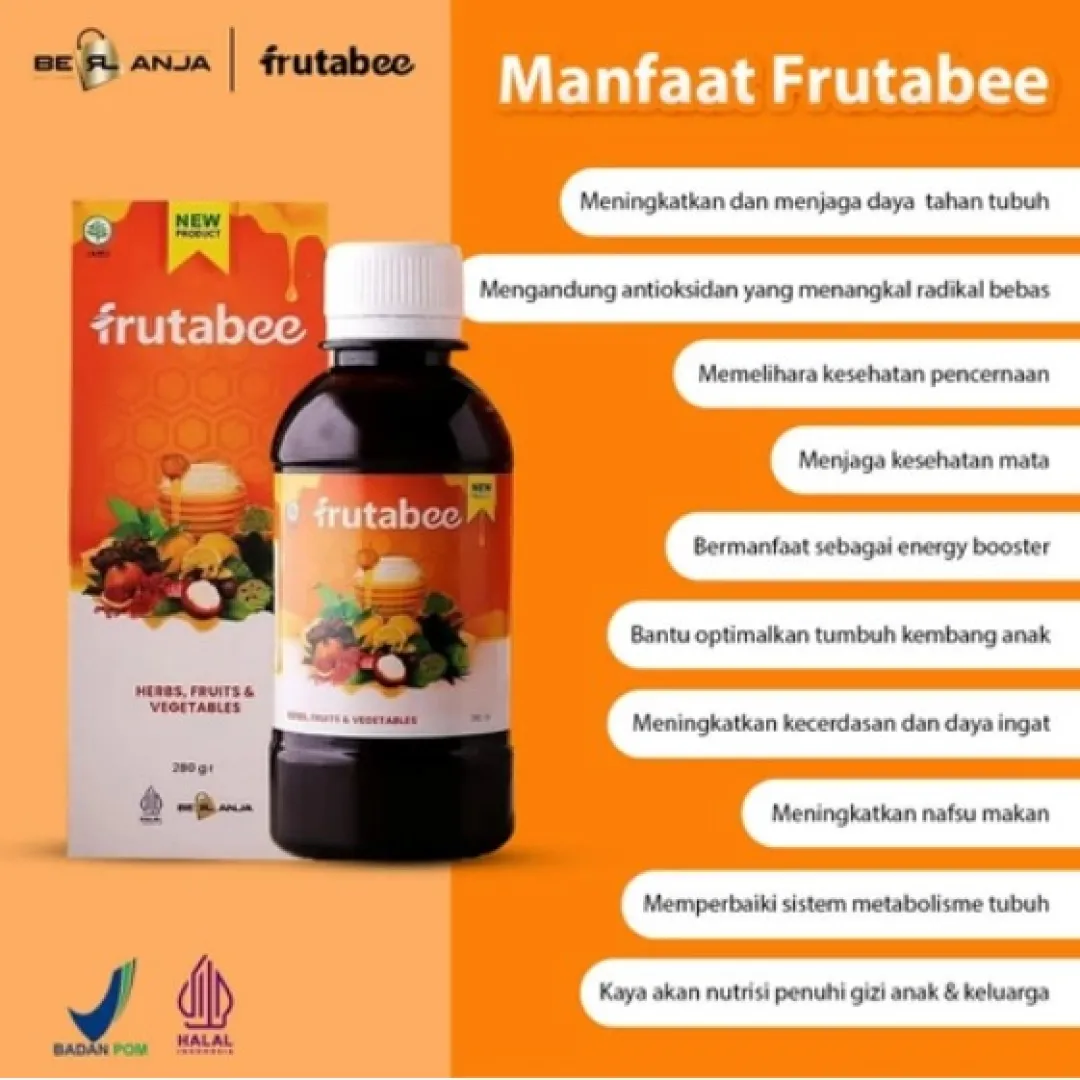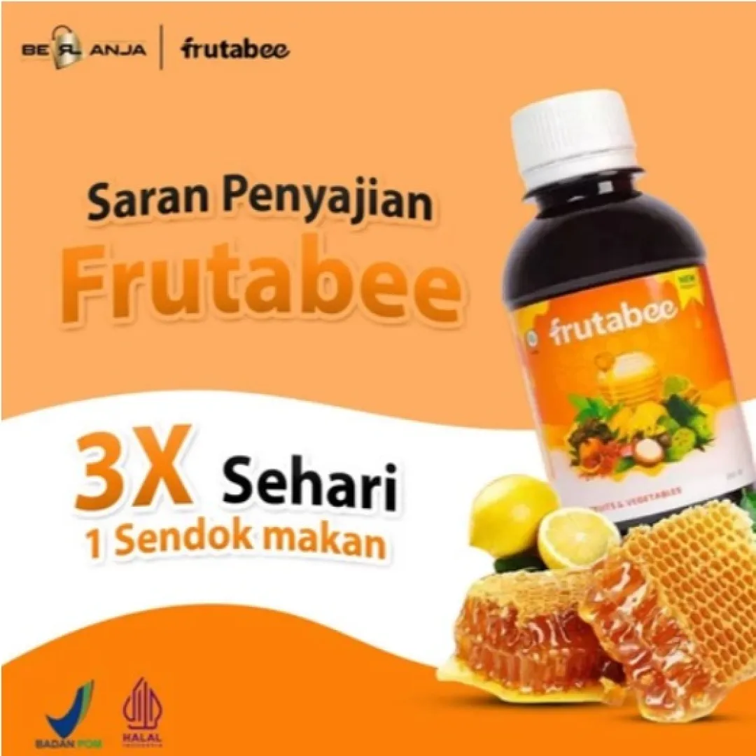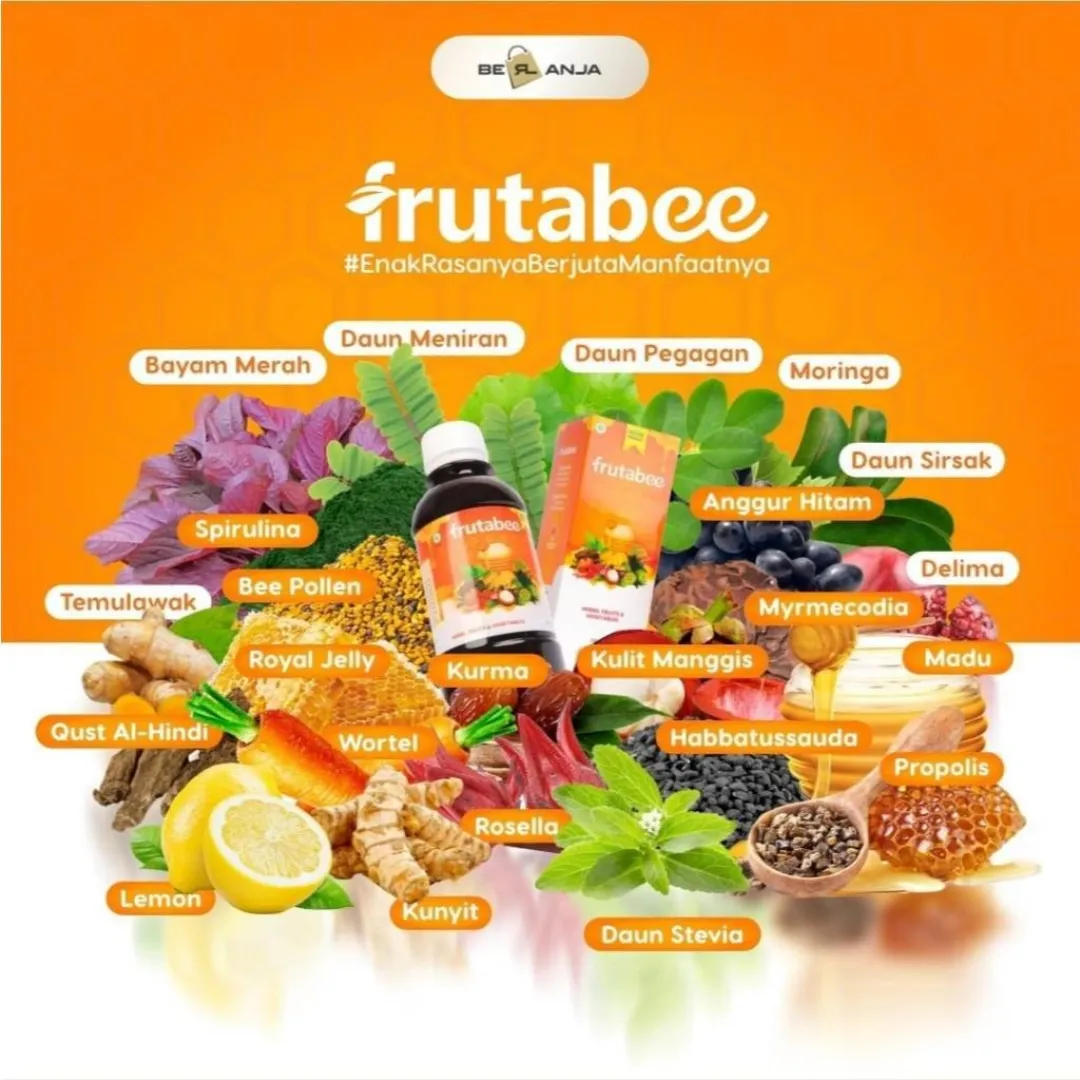 - Apakah Anda mudah merasa lelah dan capek❓ - suka susah untuk menambah berat badan / tidak nafsu makan❓ - Antibody lemah dan sering sakit ❓ - Apa itu Frutabee ❓ ✅Keunggulan Frutabee 1. Menggunakan bahan herbal yang sudah di komposisikan agar hasil bisa maksimal. 2. Sudah memiliki nomor BPOM sehingga aman untuk dikonsumsi. 3. Terbuat dari herbal alami dan sama sekali tidak ada kandungan kimia. 4. Terdapat hologram pada bagian atas kemasan untuk membuktikan keaslian dari produk. 5. Packaging eksklusif (tulisan pada packaging timbul dan bertekstur). 6. Terdapat expired date dan barcode BPOM RI pada kemasan. 7. Aturan Minum lebih praktis. 8. Bisa di konsumsi semua kalangan usia minimal dari usia 2 Tahun keatas Madu yang diperkaya dengan ekstrak buah-buahan, sayur-sayuran, dan herbal pilihan yang tinggi akan antioksidan, vitamin, dan serat alami. Frutabee diformulasikan khusus dengan menggunakan “Nano Technology” yang membuat kandungannya lebih mudah diserap oleh tubuh. ✅ Komposisi Frutabee : Madu, Kurma, Royal Jelly, Bee Pollen, Propolis, Kulit Manggis, Sarang Semut, Moringa (Daun kelor), Spirulina, Daun Sirsak, Pegagan, Daun Stevia, Delima, Lemon, Anggur Hitam, Temulawak, Kunyit, Qust Al-Hindi, Rosella, Habbatussauda, Daun Meniran, Bayam Merah, dan Wortel. CATATAN❗❗ Bila product yang anda terima rusak/pecah/bocor WAJIB SERTAKAN VIDEO UNBOXING UNTUK CLAIM PENGEMBALIAN Tidak ada video = tidak bisa diproses.. Membeli berarti setuju