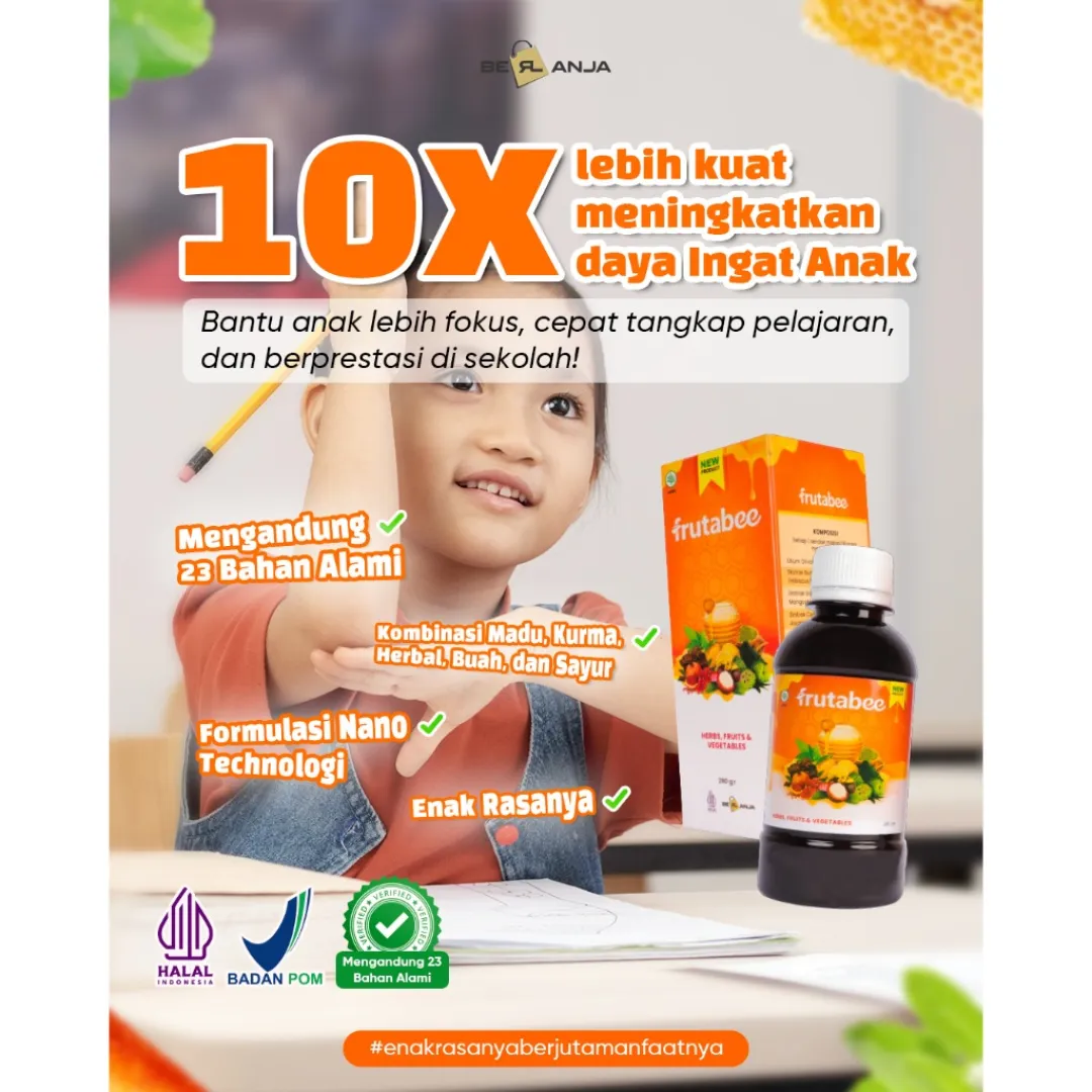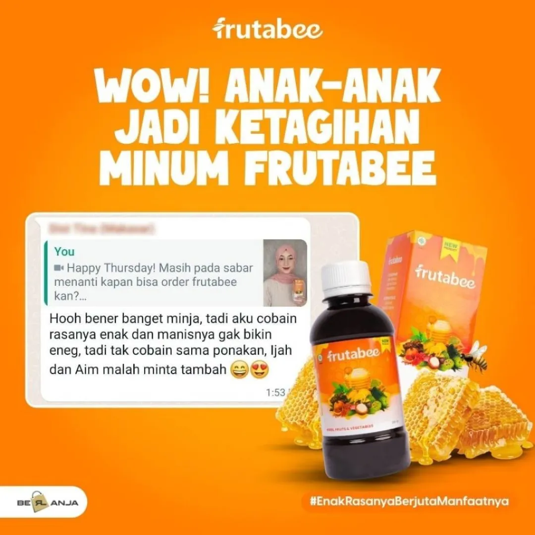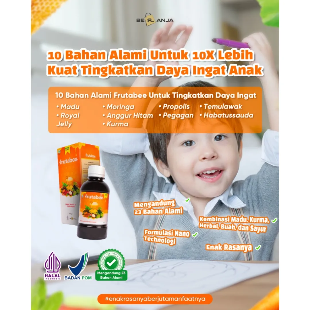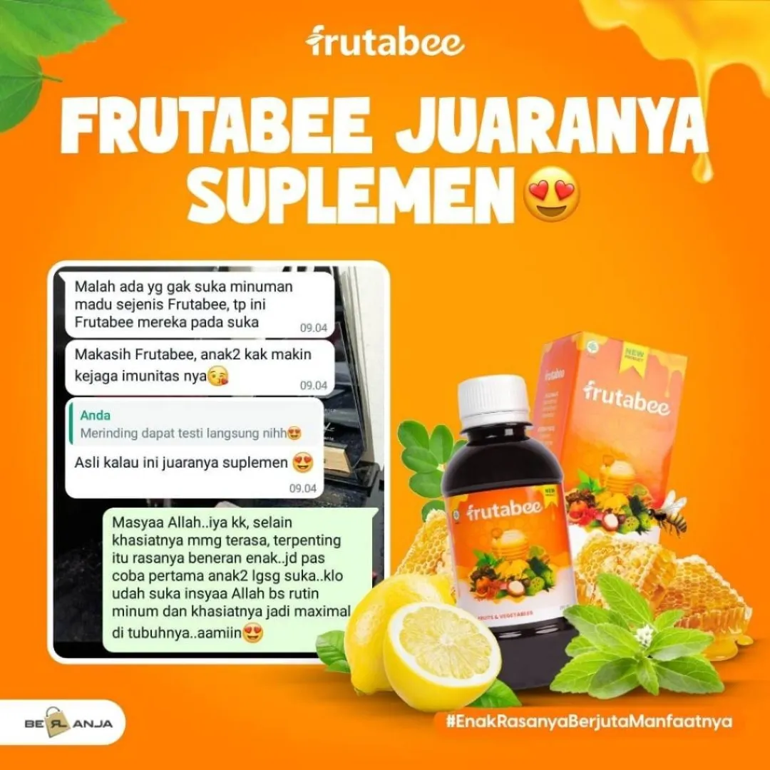 - Apakah Anda mudah merasa lelah dan capek❓ - suka susah untuk menambah berat badan / tidak nafsu makan❓ - Antibody lemah dan sering sakit ❓ - Apa itu Frutabee ❓ ✅Keunggulan Frutabee 1. Menggunakan bahan herbal yang sudah di komposisikan agar hasil bisa maksimal. 2. Sudah memiliki nomor BPOM sehingga aman untuk dikonsumsi. 3. Terbuat dari herbal alami dan sama sekali tidak ada kandungan kimia. 4. Terdapat hologram pada bagian atas kemasan untuk membuktikan keaslian dari produk. 5. Packaging eksklusif (tulisan pada packaging timbul dan bertekstur). 6. Terdapat expired date dan barcode BPOM RI pada kemasan. 7. Aturan Minum lebih praktis. 8. Bisa di konsumsi semua kalangan usia minimal dari usia 2 Tahun keatas Madu yang diperkaya dengan ekstrak buah-buahan, sayur-sayuran, dan herbal pilihan yang tinggi akan antioksidan, vitamin, dan serat alami. Frutabee diformulasikan khusus dengan menggunakan “Nano Technology” yang membuat kandungannya lebih mudah diserap oleh tubuh. ✅ Komposisi Frutabee : Madu, Kurma, Royal Jelly, Bee Pollen, Propolis, Kulit Manggis, Sarang Semut, Moringa (Daun kelor), Spirulina, Daun Sirsak, Pegagan, Daun Stevia, Delima, Lemon, Anggur Hitam, Temulawak, Kunyit, Qust Al-Hindi, Rosella, Habbatussauda, Daun Meniran, Bayam Merah, dan Wortel. CATATAN❗❗ Bila product yang anda terima rusak/pecah/bocor WAJIB SERTAKAN VIDEO UNBOXING UNTUK CLAIM PENGEMBALIAN Tidak ada video = tidak bisa diproses.. Membeli berarti setuju